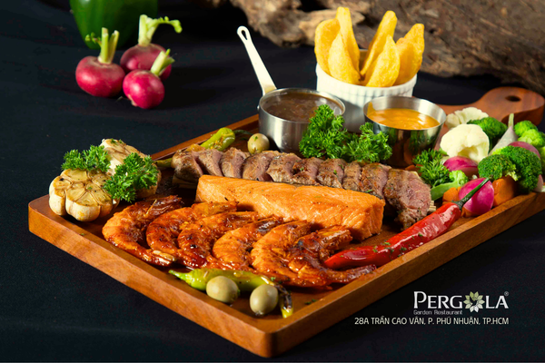 Điểm cộng lớn của Pergola Garden chính là ẩm thực Việt Nam kết hợp phong cách hiện đại. Thực đơn đa dạng từ mâm cơm trưa đậm đà hương quê, các set menu tiệc gia đình, cho đến khay nướng BBQ hấp dẫn.